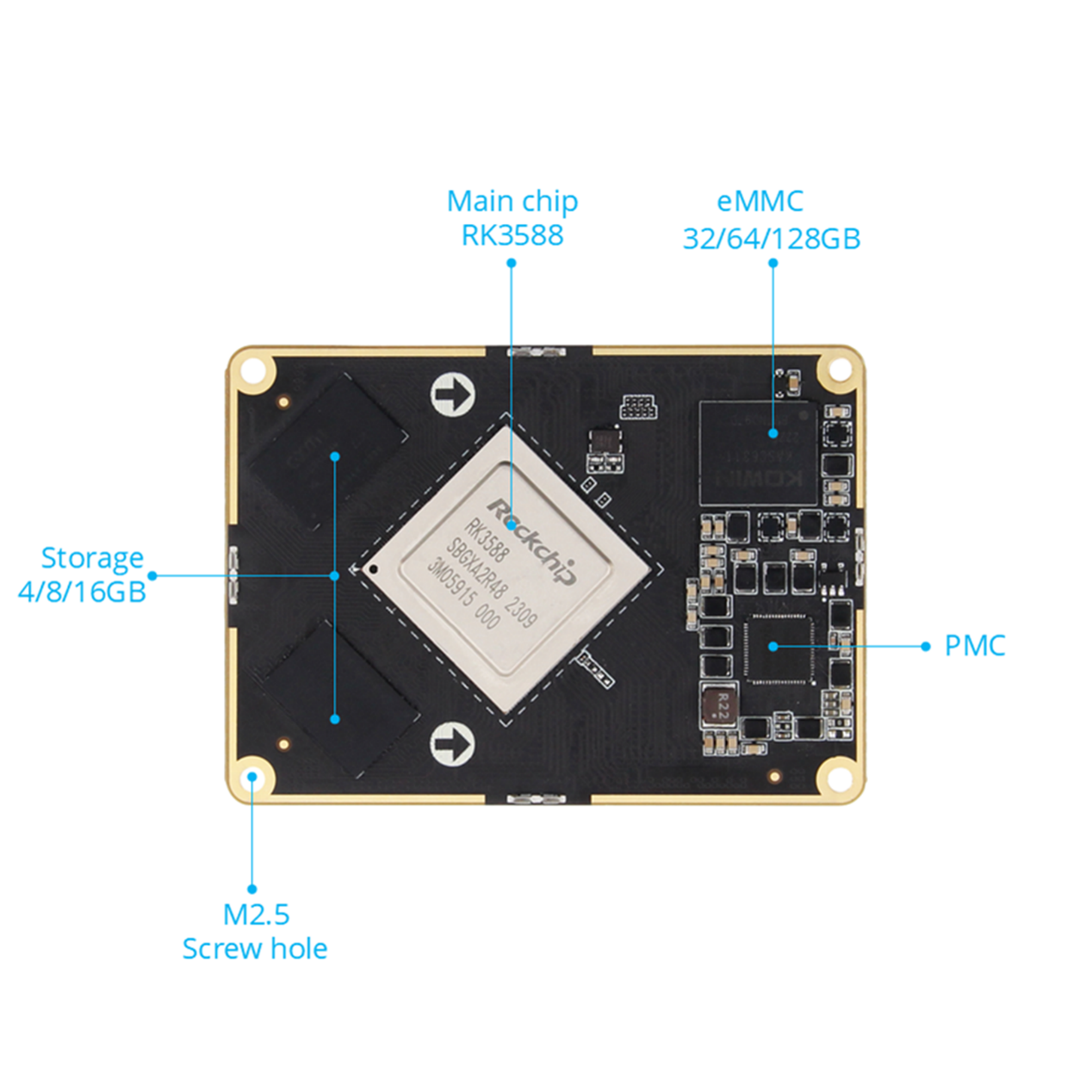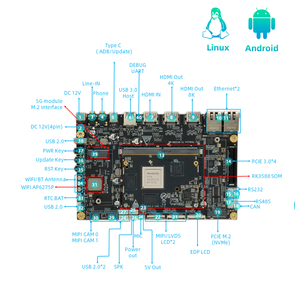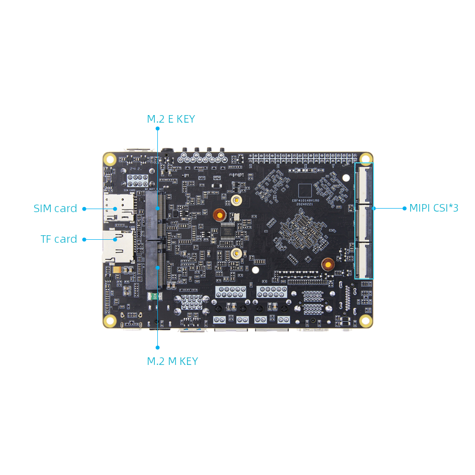 • Alapkonfiguráció: 16 GB LPDDR5 RAM + 128 GB eMMC, kettős Gigabit Ethernet port, két USB 2.0 port, két USB 2.1 port, hat MIPI CSI port, két MIPI DSI port, Mini-PCle interfész (támogatja a Wi-Fi hálózati kártyákat, 4G modulokat, vagy egyéb 5G modules-4 pineket), bővítőport (kompatibilis a Raspberry Pi 40 tűs porttal, támogatja a PWM-et, GPIO-t, PCI Express-t, SPI-t, UART-ot és CAN-t), M.2 M-KEY kompatibilis az M.2 SSD-kkel